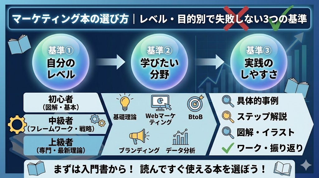 マーケティング本の選び方|レベル・目的別で失敗しない3つの基準 結論から言うと、マーケティング本選びで失敗しないためには「自分のレベル」「学びたい分野」「実践のしやすさ」の3つを基準にすることが重要です。 書店に行くと数百冊のマーケティング... -